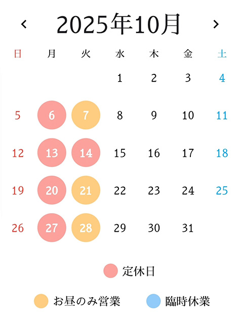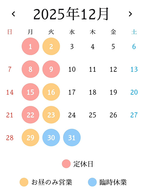 今月は臨時休業の予定はありません。変更がある場合は、お知らせいたします。