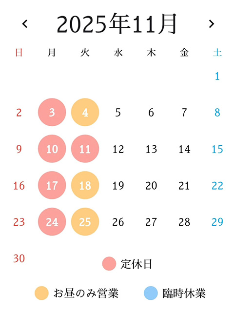 今月は臨時休業の予定はありません。変更がある場合は、お知らせいたします。