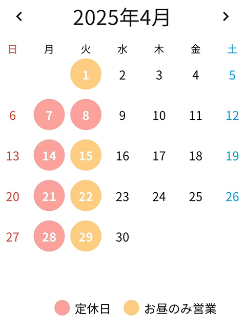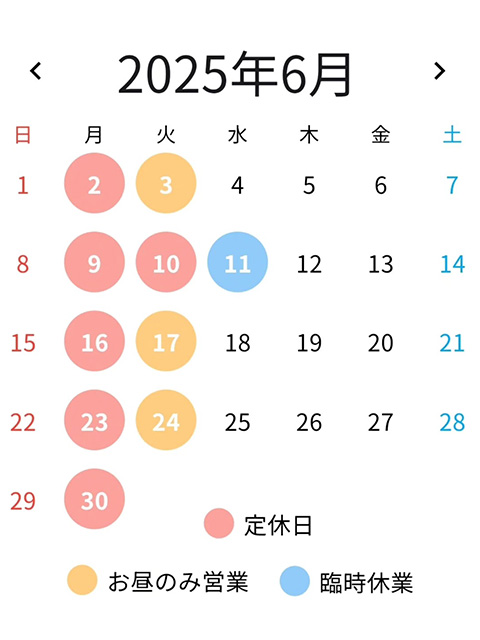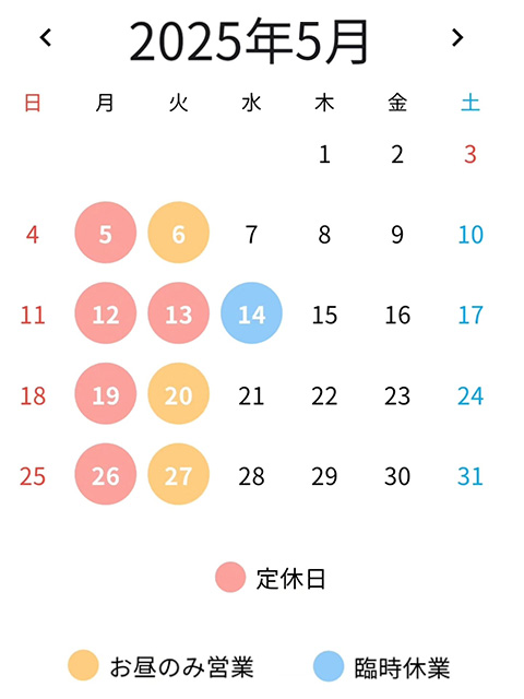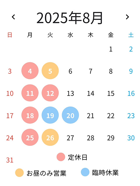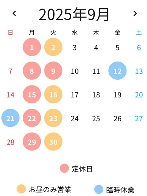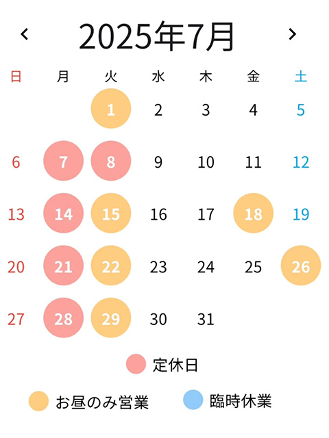 今月は臨時休業の予定はありません。変更がある場合は、お知らせいたします。